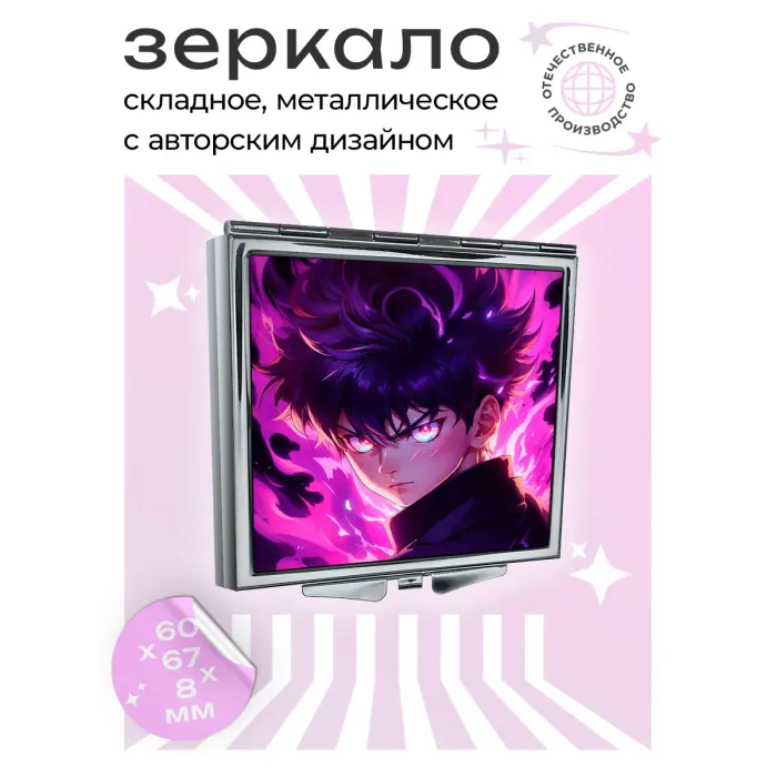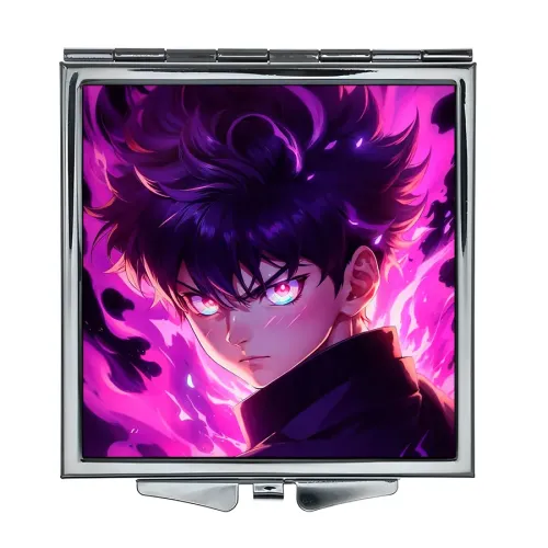Складное квадратное зеркало с полноцветной печатью изображения в стиле аниме на металлической поверхности.