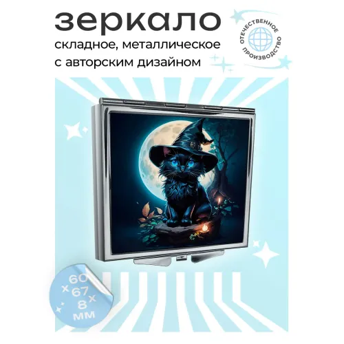 Складное квадратное зеркало с изображением черной кошки. Материалы: металл и стекло.