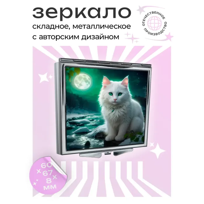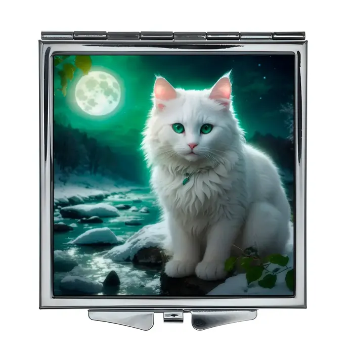 Складное зеркало квадратной формы с изображением белой кошки. Материалы: металл и стекло.