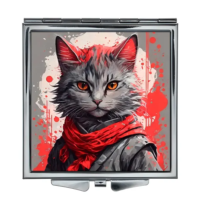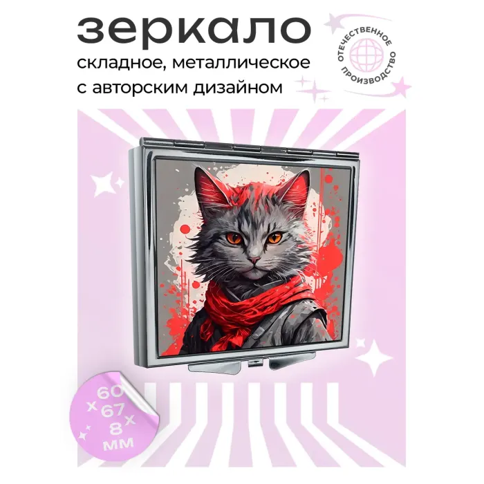 Складное зеркало квадратной формы с изображением кота в повязке. Материалы: металл и стекло.