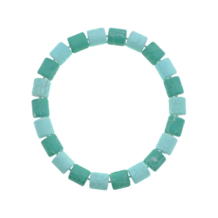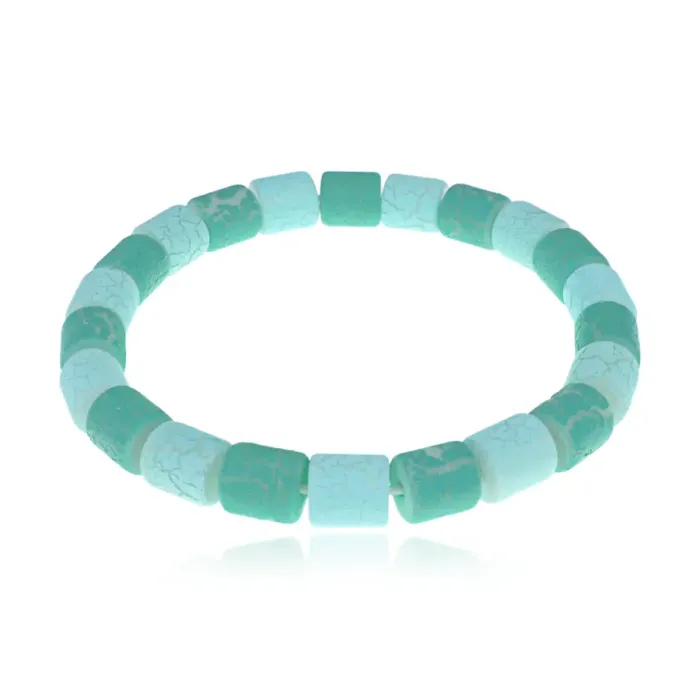Комплект бижутерии из пластика, состоящий из бус на леске и стрейч-браслета в бирюзовых и голубых оттенках.
