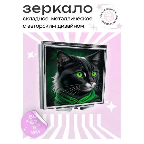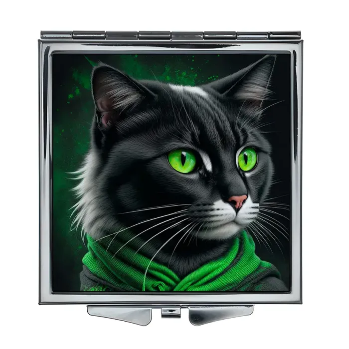 Складное квадратное зеркало с полноцветным изображением кота в капюшоне.
