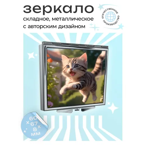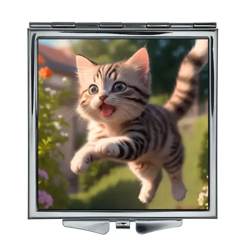 Складное квадратное зеркало с полноцветным изображением котёнка в прыжке.