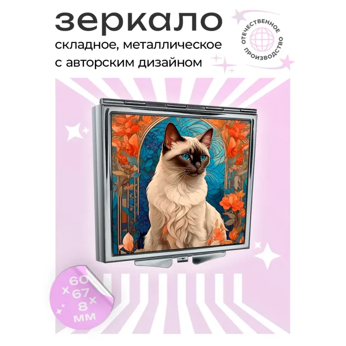 Складное зеркало квадратной формы с изображением сиамской кошки. Материалы: металл и стекло.