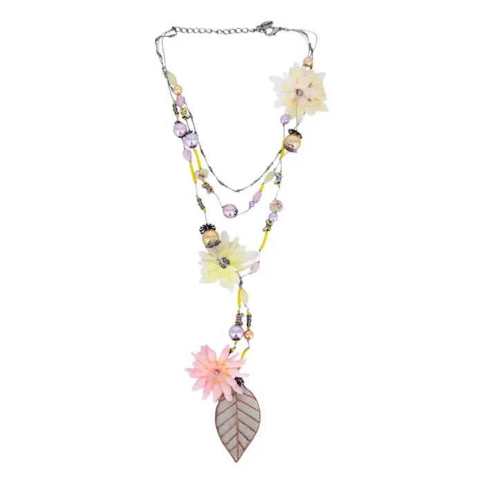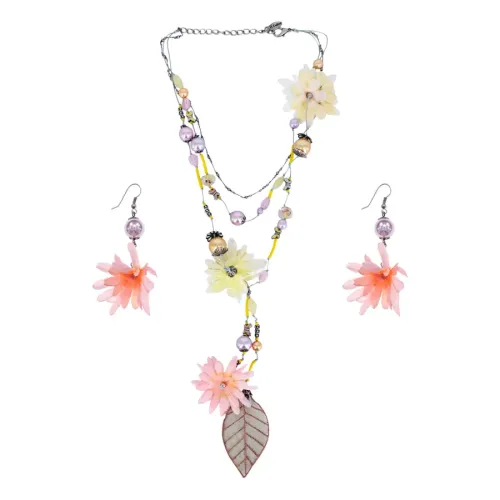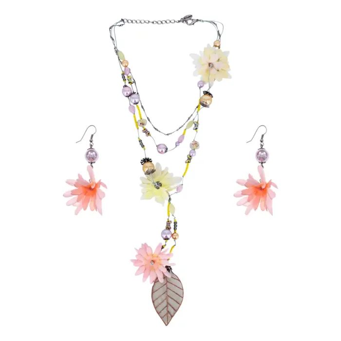 Комплект бижутерии, состоящий из колье и серёг. Материал — металл с покрытием, пластик, стекло, текстиль.