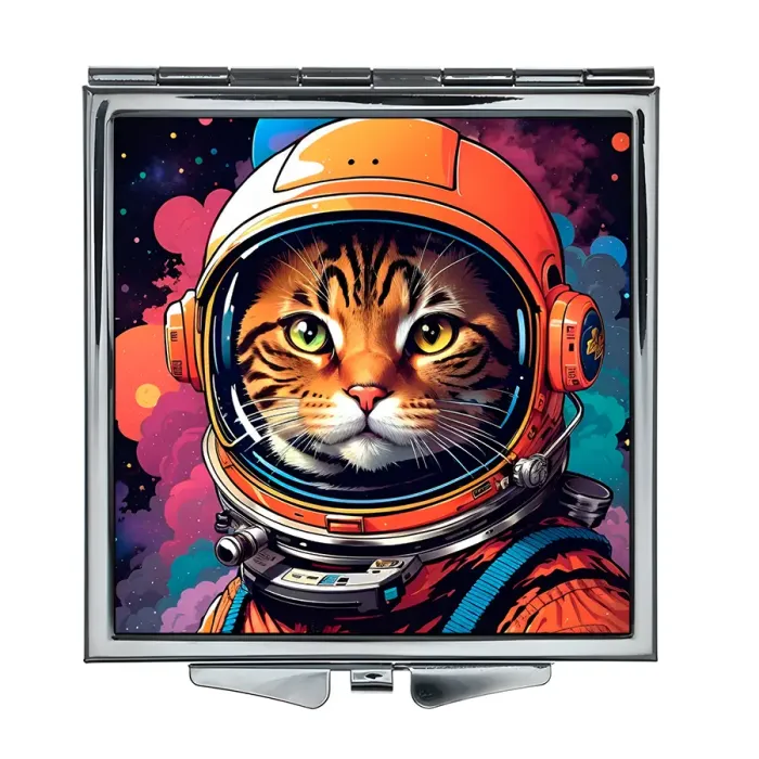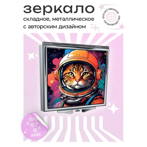 Складное зеркало квадратной формы с изображением кота-астронавта. Изготовлено из металла и стекла.
