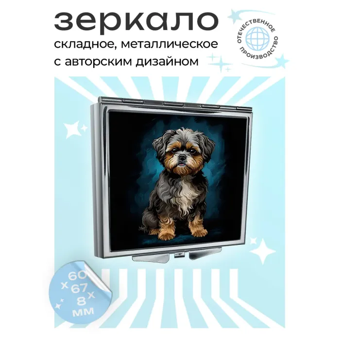 Складное зеркало квадратной формы с изображением собаки. Изготовлено из металла и стекла.