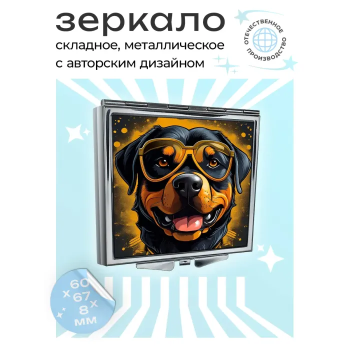 Складное зеркало квадратной формы с изображением собаки в очках. Изготовлено из металла и стекла.