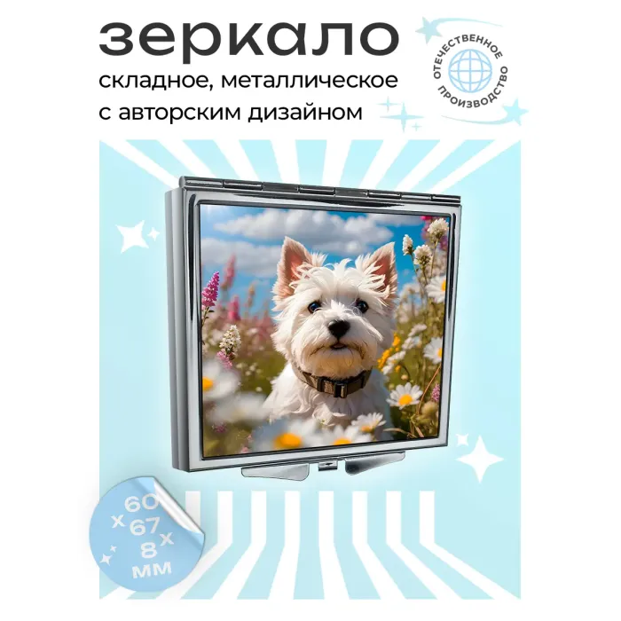 Складное зеркало квадратной формы с изображением терьера на фоне поля. Изготовлено из металла и стекла.
