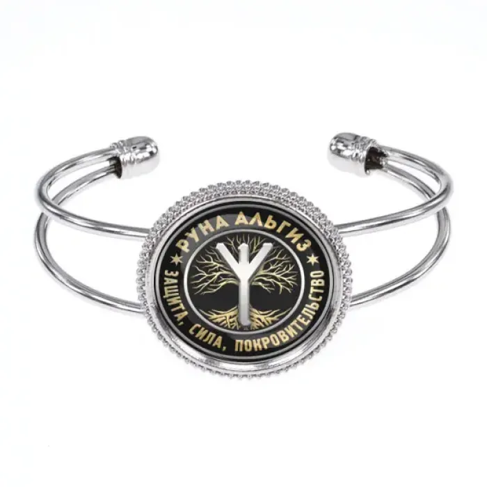 Браслет-сувенир из бижутерного сплава с покрытием под серебро и стеклянным элементом.