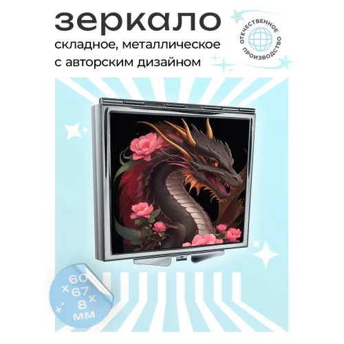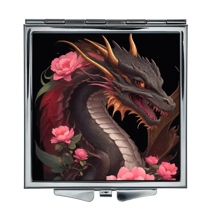 Складное зеркало квадратной формы с изображением дракона и цветов.