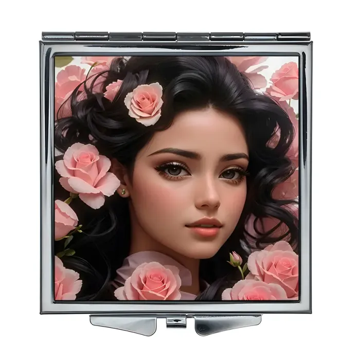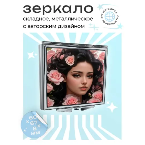 Складное зеркало квадратной формы с полноцветным изображением женщины и цветов.