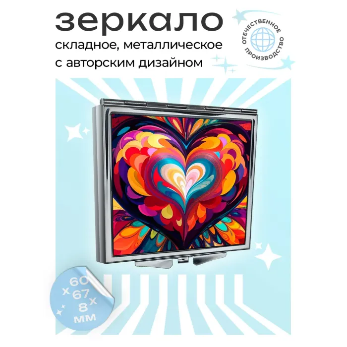 Складное зеркало квадратной формы с изображением сердца. Материалы: металл и стекло.