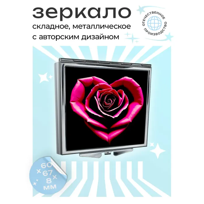 Складное квадратное зеркало с изображением розы в сердце. Материалы: металл и стекло.