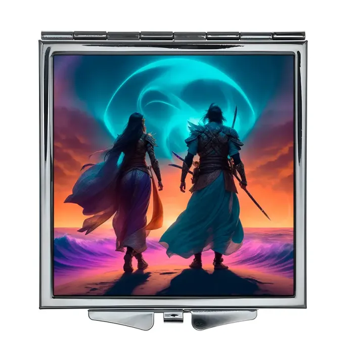 Складное квадратное зеркало с полноцветным изображением «Пара в пустыне».