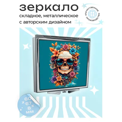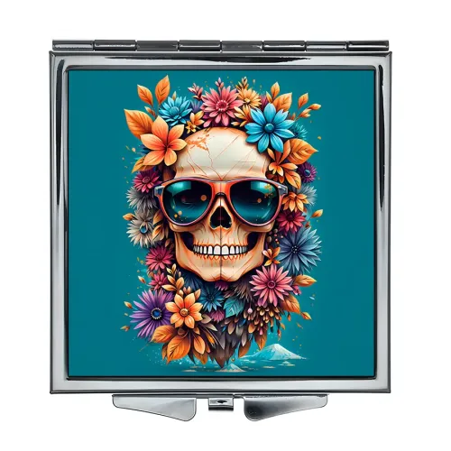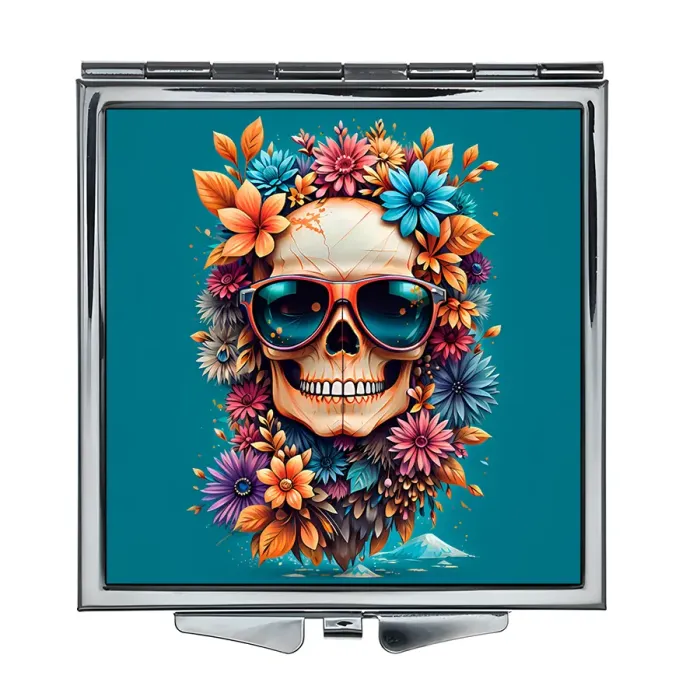 Складное зеркало квадратной формы для личного использования. Материал: металл и стекло. Дизайн: полноцветная печать с изображением черепа в очках и цветами.