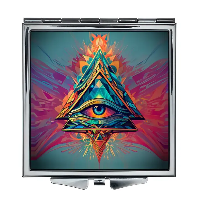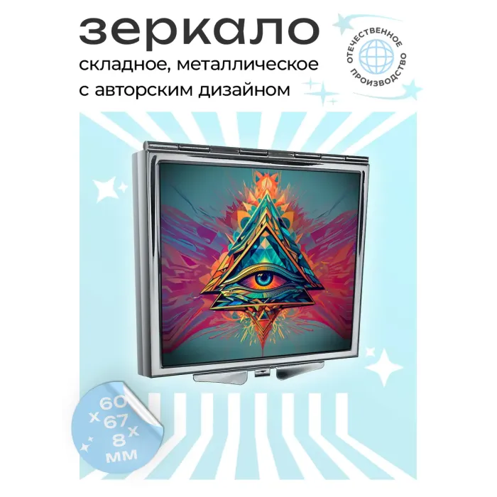 Складное зеркало квадратной формы с изображением Всевидящего глаза. Изготовлено из металла и стекла.