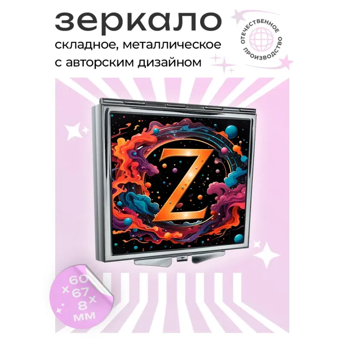 Складное зеркало квадратное для переноски, выполнено из металла и стекла с полноцветной печатью.