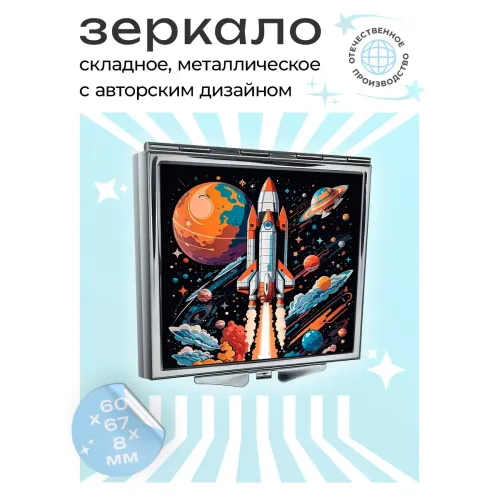 Складное зеркало квадратной формы с изображением на космическую тему. Изготовлено из металла и стекла.