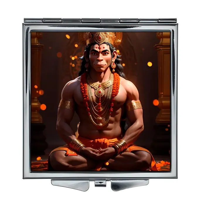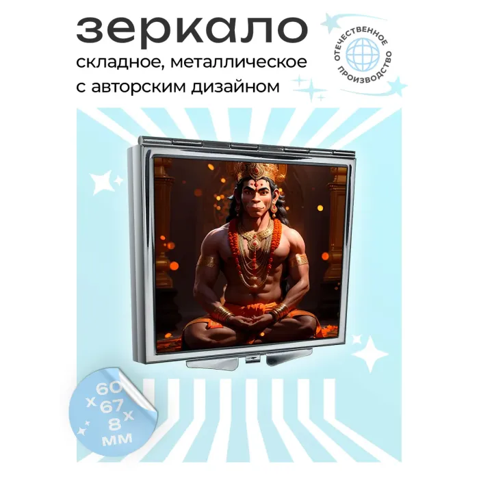 Складное квадратное зеркало с изображением Ханумана. Изготовлено из металла и стекла.