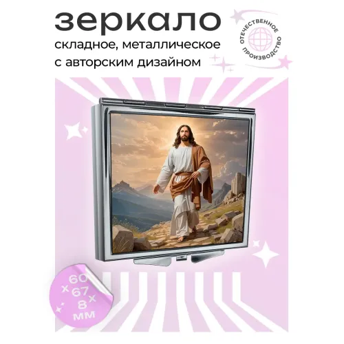 Складное квадратное зеркало с изображением Иисуса. Сувенирный аксессуар из металла и стекла.