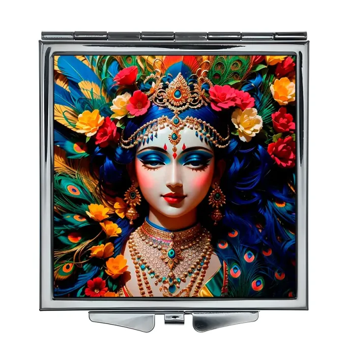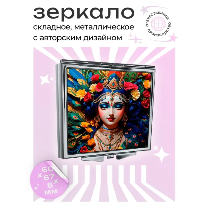 Складное зеркало квадратной формы с изображением девушки с цветами.