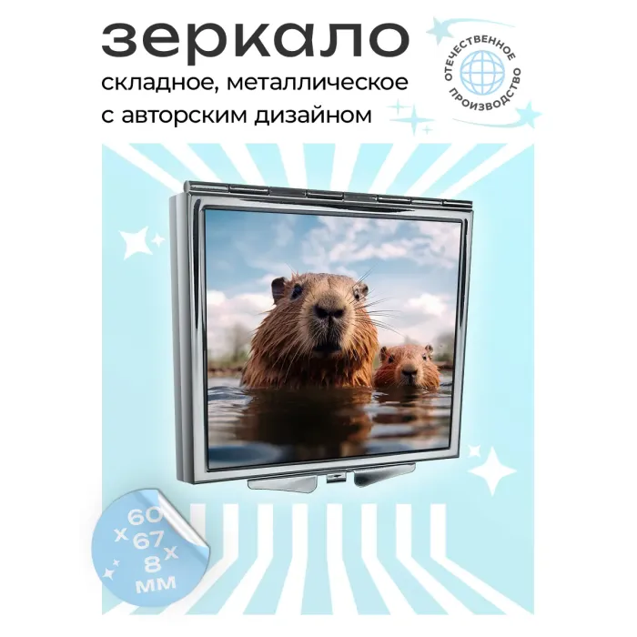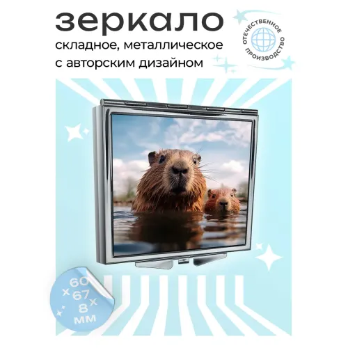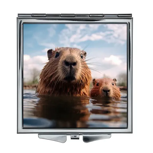 Складное зеркало квадратной формы с изображением капибары. Сувенирный аксессуар.