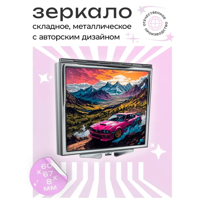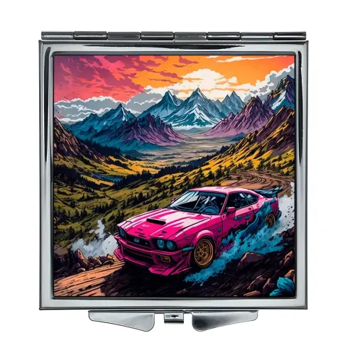 Складное зеркало квадратной формы с изображением спортивного автомобиля.