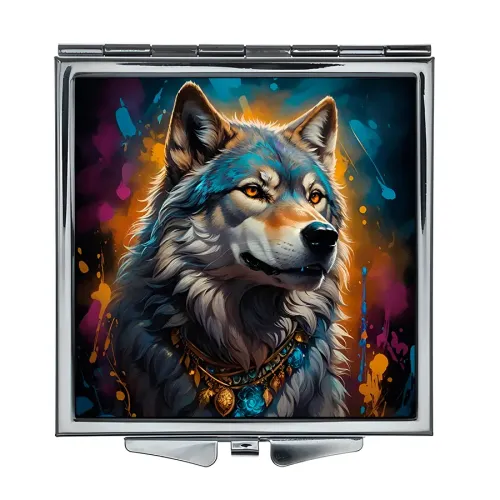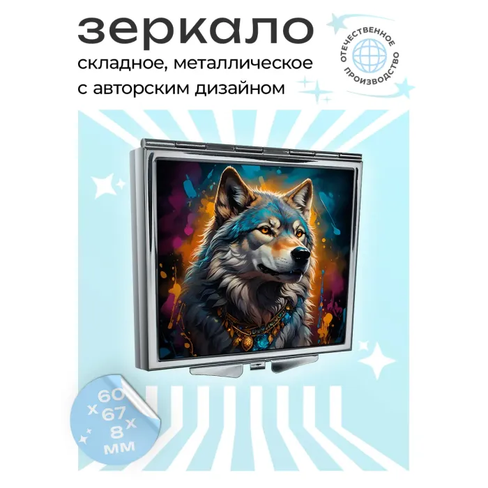 Складное зеркало квадратной формы с изображением волка. Изготовлено из металла и стекла.