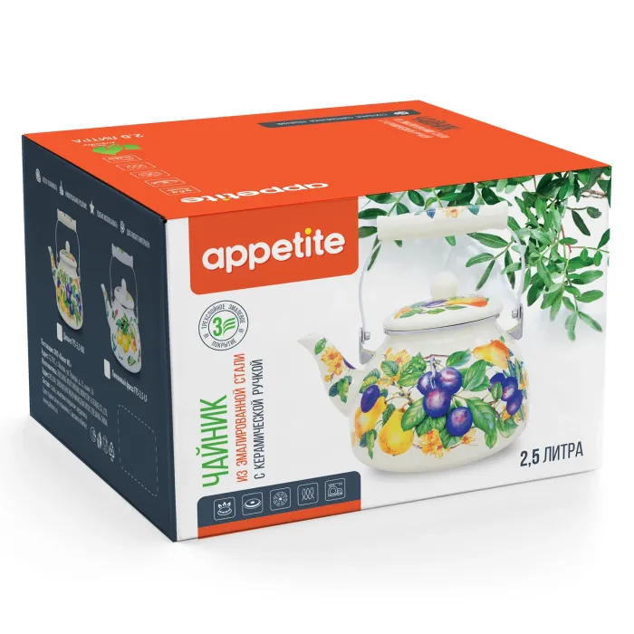 - Материал: эмалированная сталь- Объём: 2,5 л- Совместимость: все типы плит (газовые, электрические, стеклокерамические, индукционные)- Особенности ухода: допускается мытьё в посудомоечной машине