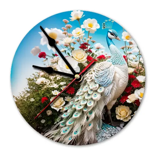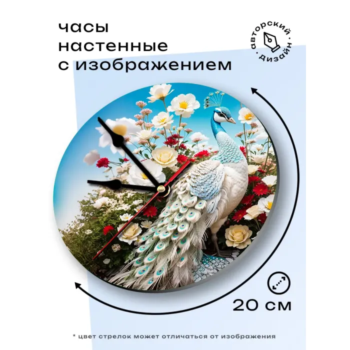 Настенные часы с изображением белого павлина. Циферблат диаметром 20 см выполнен из вспененного пластика ПВХ, изображение нанесено методом наклейки.