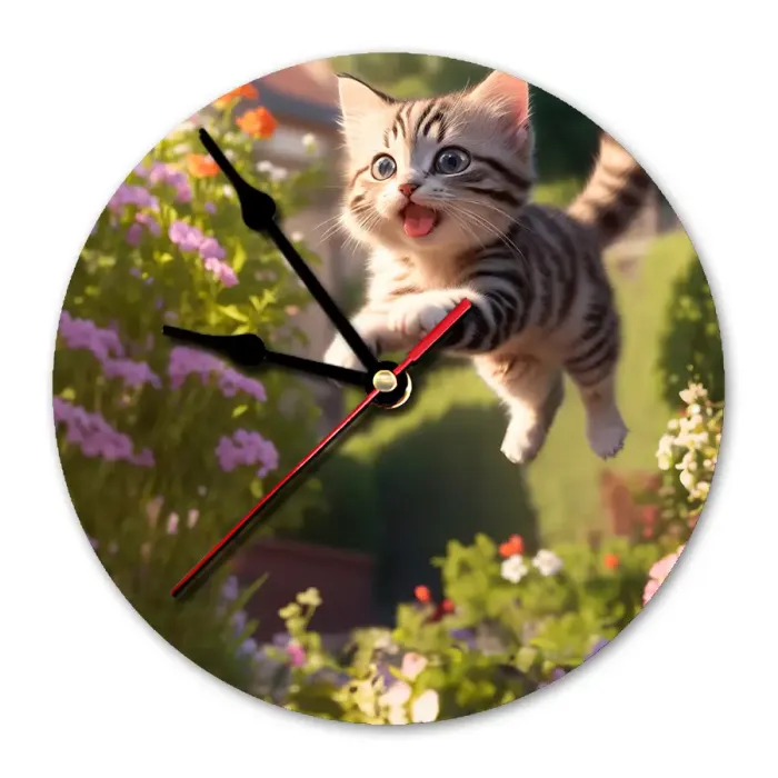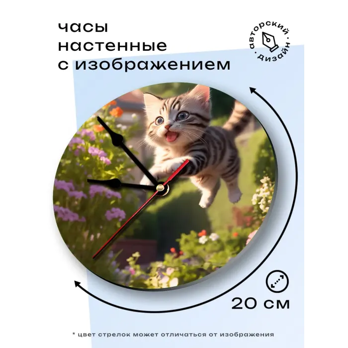 Настенные часы с изображением котёнка в прыжке. Циферблат диаметром 20 см выполнен из вспененного пластика ПВХ.