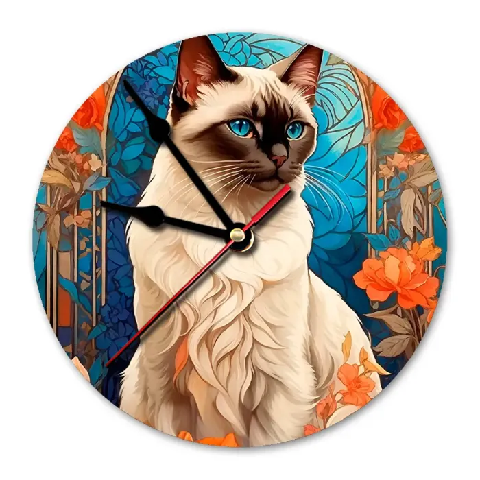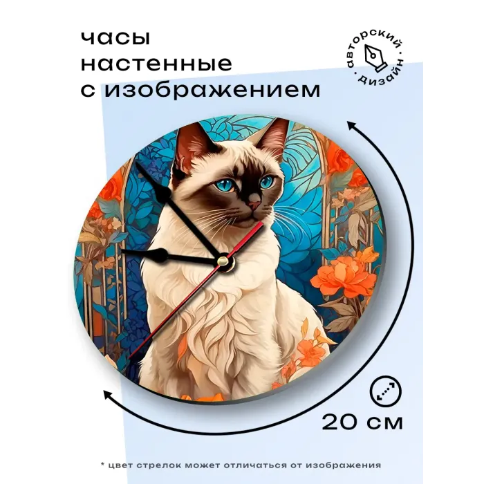 Настенные часы с изображением сиамской кошки. Циферблат выполнен из вспененного пластика ПВХ, изображение нанесено методом наклейки.