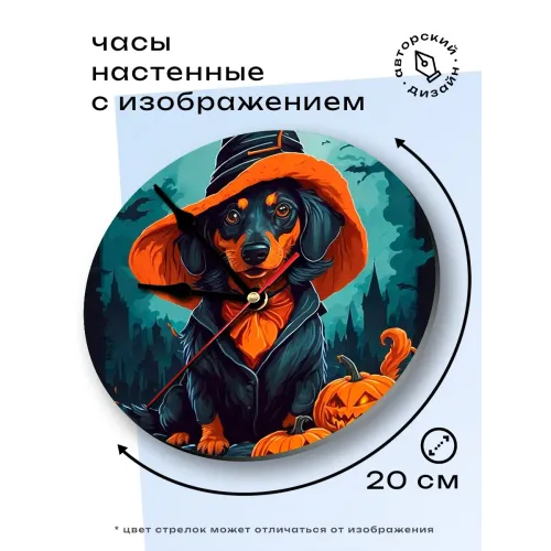 Настенные часы с тематическим дизайном «Такса Хэллоуин». Циферблат диаметром 20 см выполнен из вспененного пластика ПВХ, изображение нанесено методом наклейки.