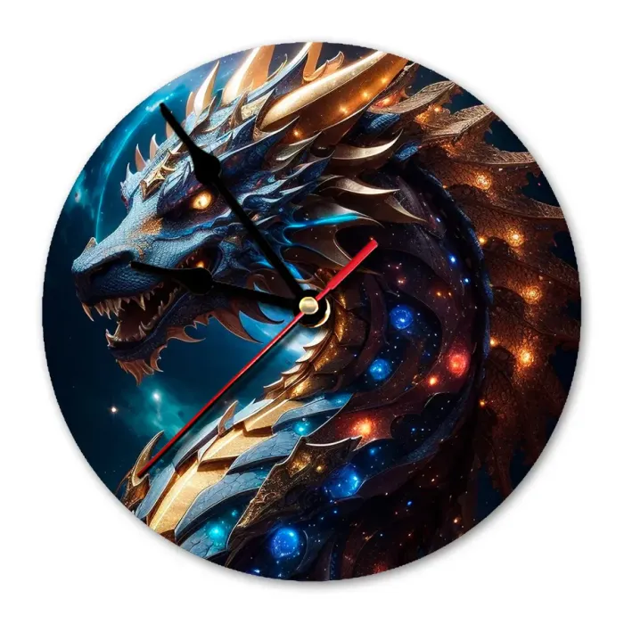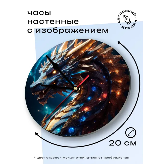 Настенные часы с изображением космического дракона. Циферблат диаметром 20 см изготовлен из вспененного пластика ПВХ.
