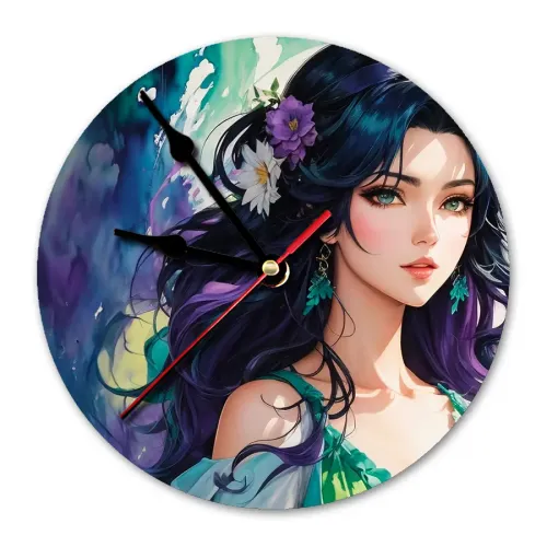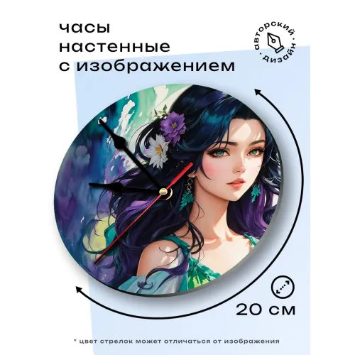 Настенные часы с изображением аниме-девушки. Циферблат диаметром 20 см выполнен из вспененного пластика ПВХ.
