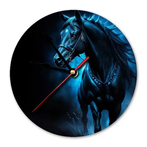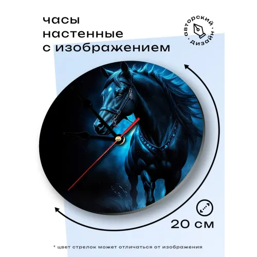 Настенные часы с изображением лошади — это не только функциональный предмет, но и стильный элемент декора. Циферблат диаметром 20 см выполнен из лёгкого вспененного пластика ПВХ, что делает его практичным и долговечным. Часы оснащены петлёй для удобного подвешивания на стену, а метод нанесения изображения — наклейка — гарантирует яркость и чёткость рисунка.