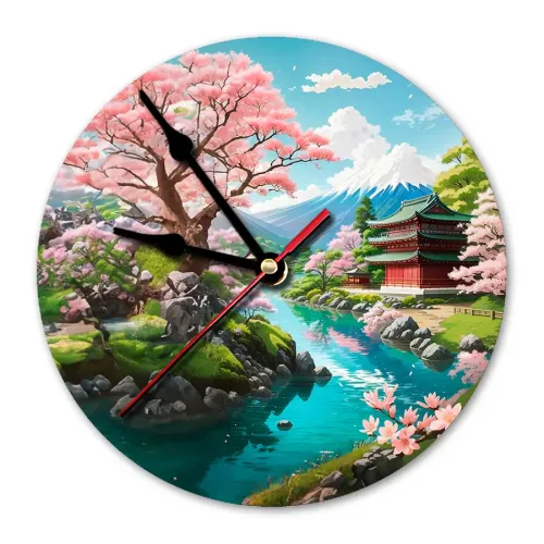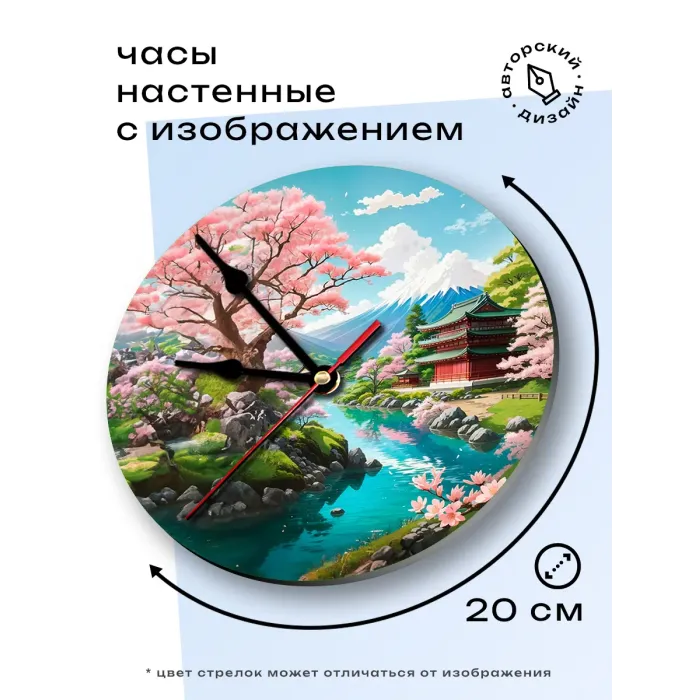 Настенные часы с изображением японского пейзажа. Циферблат диаметром 20 см выполнен из вспененного пластика ПВХ, имеет петлю для подвешивания.