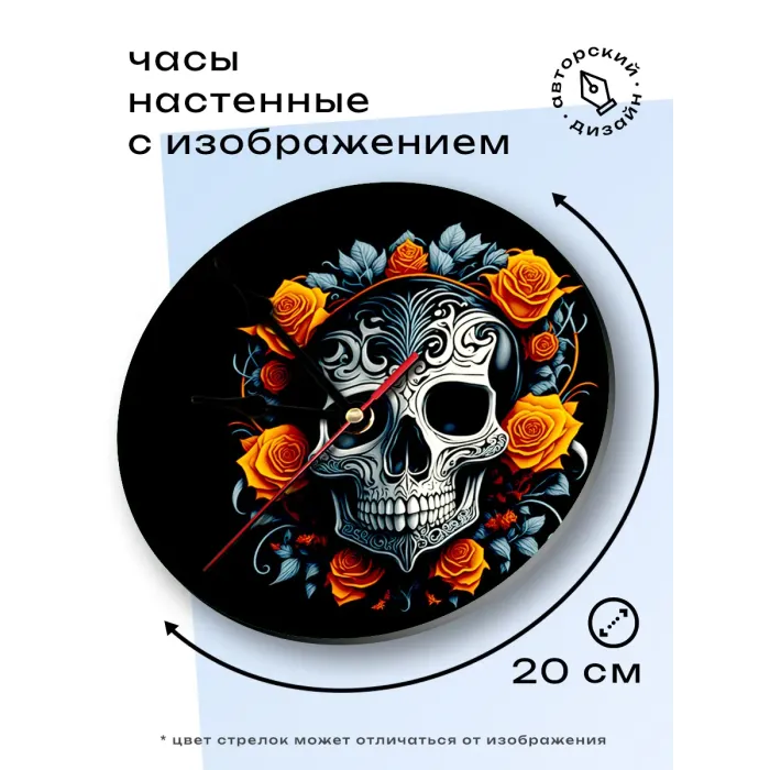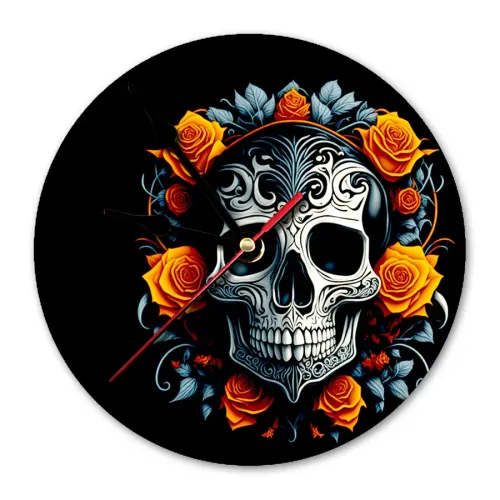 Настенные часы с изображением черепа с венком. Циферблат изготовлен из вспененного пластика ПВХ, диаметр 20 см.