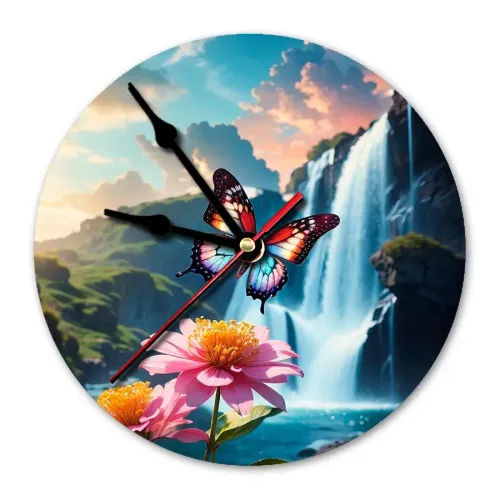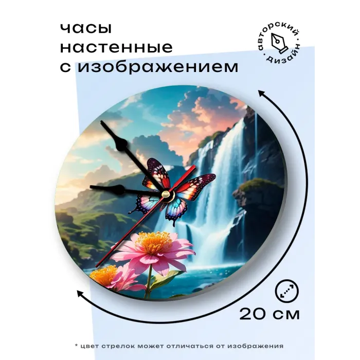 Настенные часы с изображением бабочки на фоне водопада. Циферблат выполнен из вспененного пластика ПВХ.