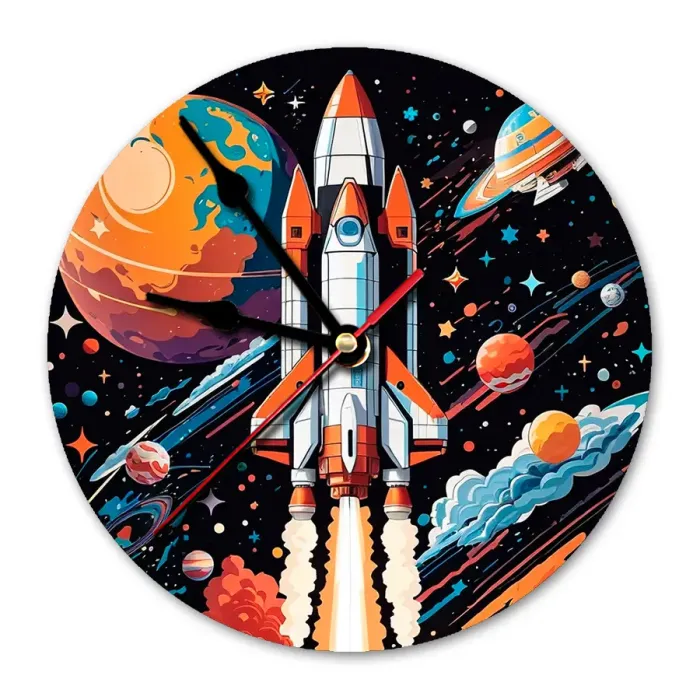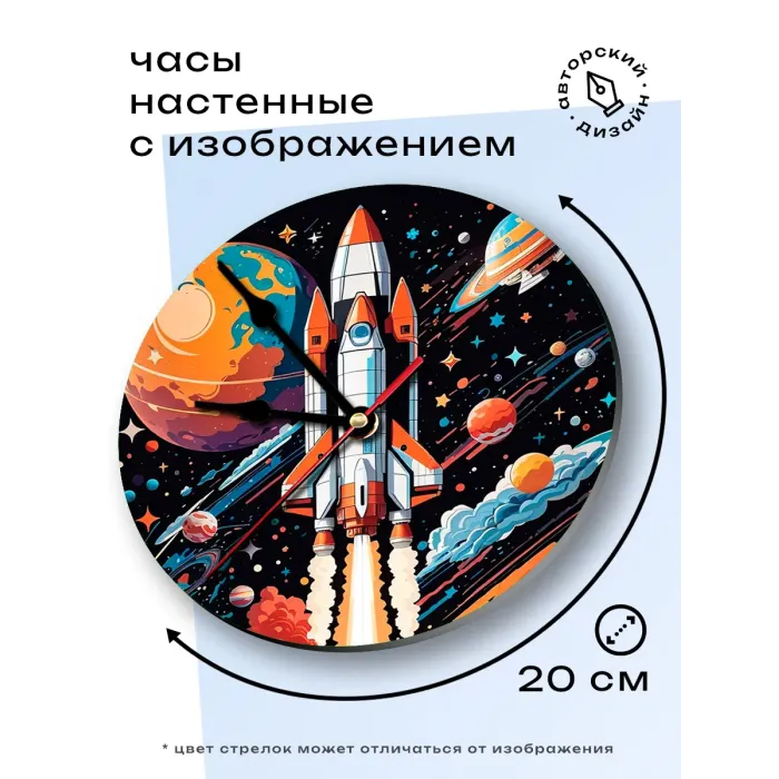 Настенные часы с тематическим дизайном «Полёт в космос». Циферблат диаметром 20 см изготовлен из вспененного ПВХ.
