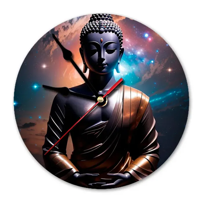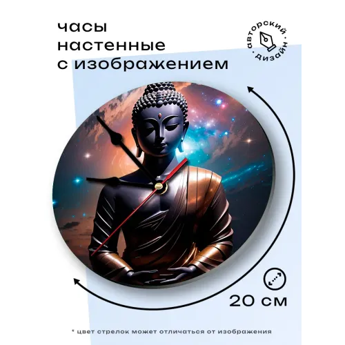 Настенные часы с изображением Будды. Циферблат диаметром 20 см выполнен из вспененного пластика ПВХ, оснащён петлёй для подвешивания.