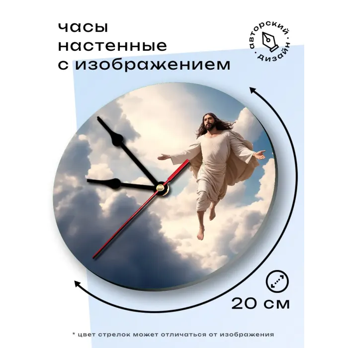 Настенные часы с изображением Иисуса. Циферблат диаметром 20 см выполнен из вспененного пластика ПВХ, изображение нанесено методом аппликации.