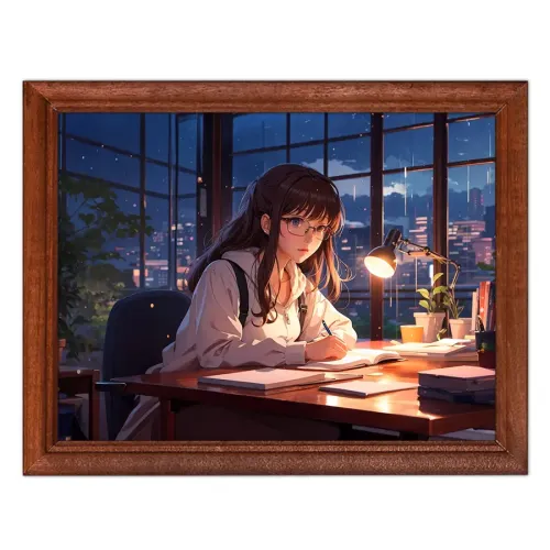Постер в рамке для интерьерного декора. Изображение аниме девушки в очках, деревянная рамка под стеклом.