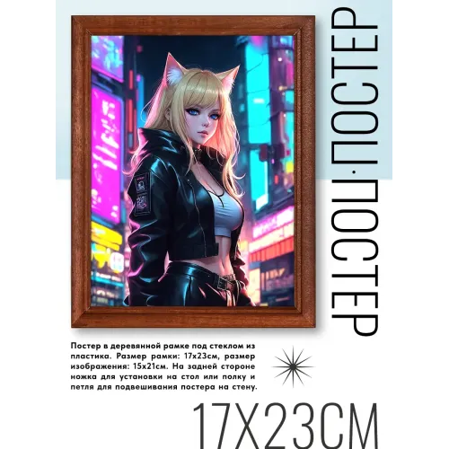 Постер в деревянной рамке с изображением аниме-девушки. Размер рамки 17х22 см, изображения — 15х20 см.