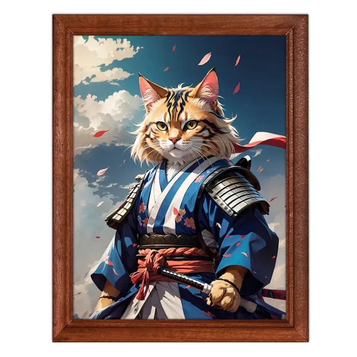 Постер в рамке для интерьерного декора с изображением кота-самурая.