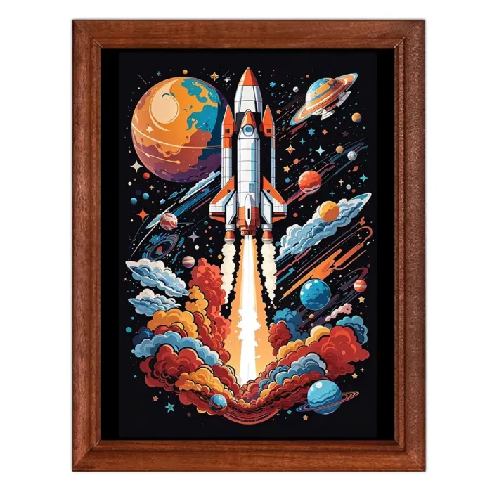 Постер в рамке для интерьерного декора. Изображение на тему космоса, обрамлено деревянной рамкой под стеклом.