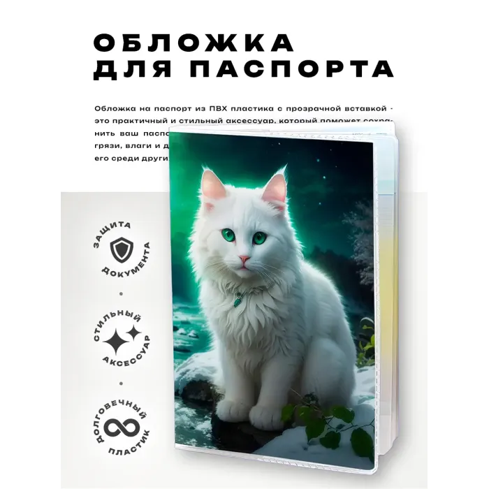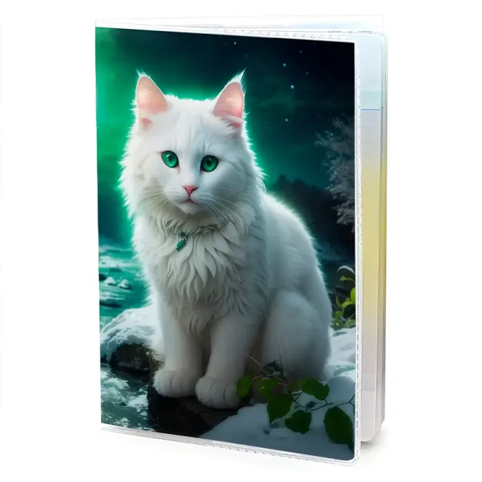 Обложка для паспорта из прозрачного ПВХ пластика с полиграфической вставкой, изображающей белую кошку.