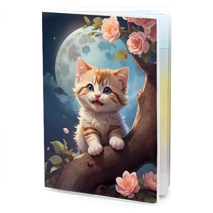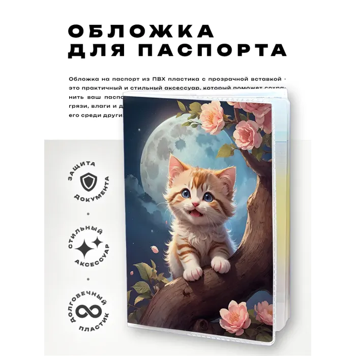 Обложка для паспорта из прозрачного ПВХ пластика с изображением котёнка на дереве.