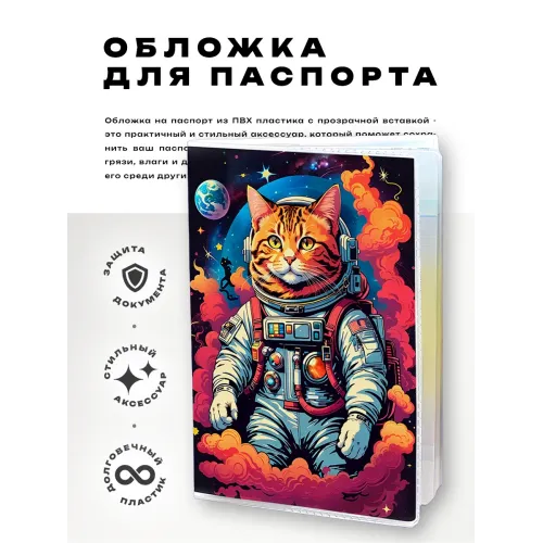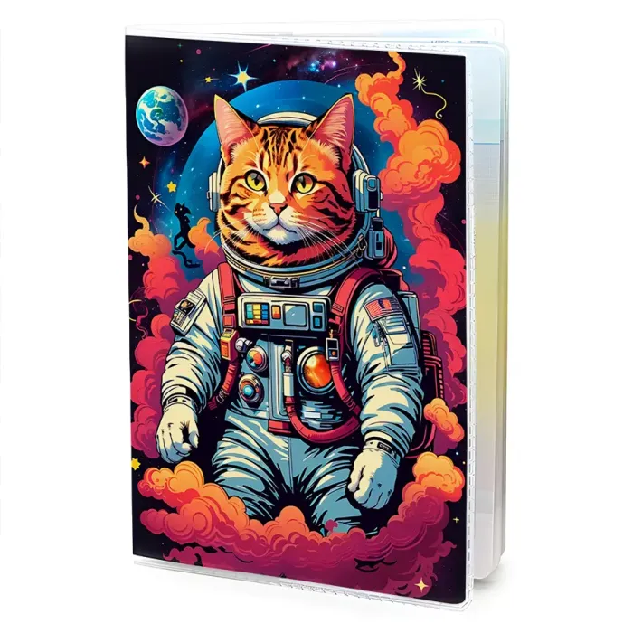 Обложка для паспорта из прозрачного ПВХ пластика с полиграфической вставкой с изображением кота-космонавта.